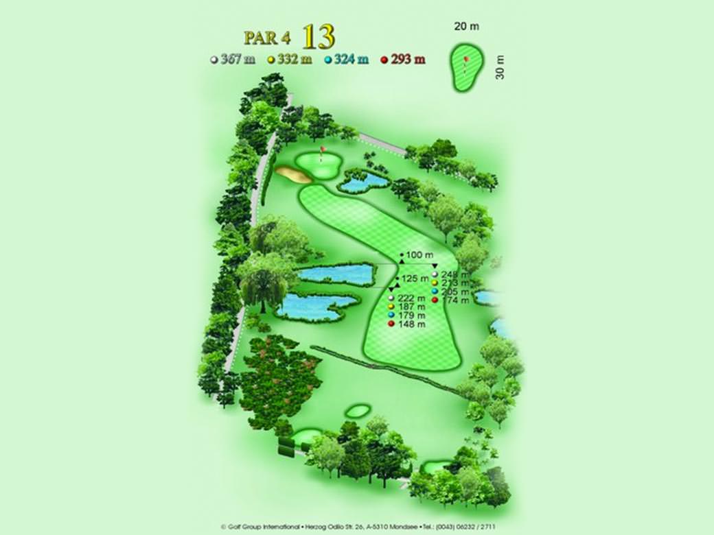 De l’eau partout, hors-limites à gauche du tee au green, vue imprenable sur les sommets enneigés du Mont-Blanc au loin.