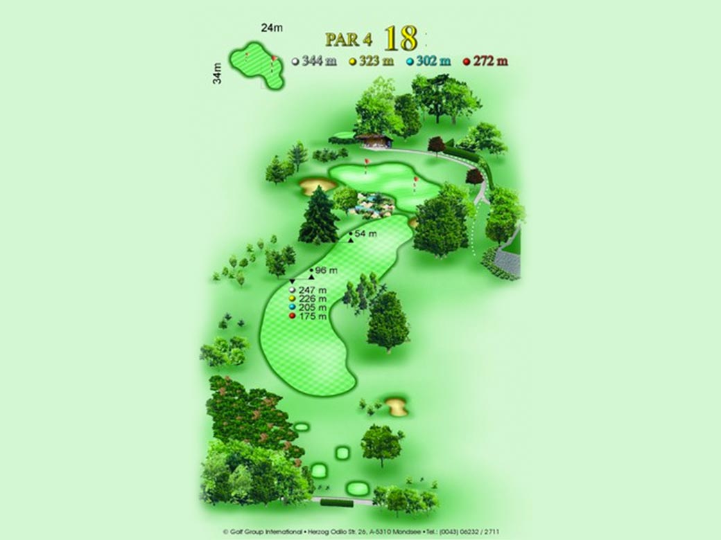 En montée du tee au green. Le second coup vers le double green (9 & 18) requiert un choix de club judicieux pour porter la balle jusque sur le plateau supérieur. Ou ne serait-ce que pour éviter l’obstacle d’eau à gauche en entrée de green.