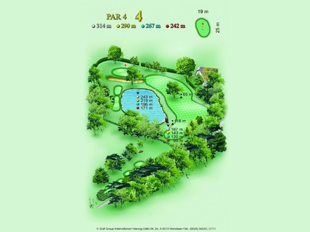 Dogleg gauche avec un étang bordant tout le côté gauche. Un bunker et un arbre imposant protègent le green. Cet arbre entre particulièrement en jeu lorsque le drapeau est planté sur la gauche du green.