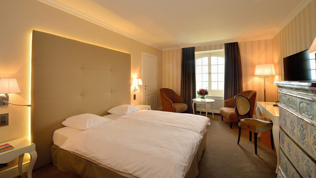 Plafonds hauts et poêles anciens vous séduiront dans nos chambres Deluxe situées au Château. Elles bénéficient d’une vue magique sur le Léman et les Alpes. Leur salle de bain donne sur les arbres centenaires du jardin.