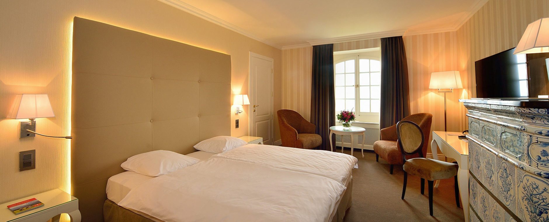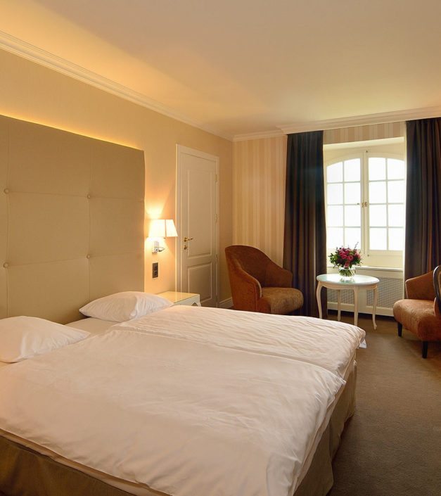 Les chambres Deluxe du Prieuré ont vue sur les jardins et le parc et disposent d’une vaste salle de bain avec fenêtre. L’une d’entre elles dispose encore à ce jour d’une luxueuse robinetterie à l’ancienne.